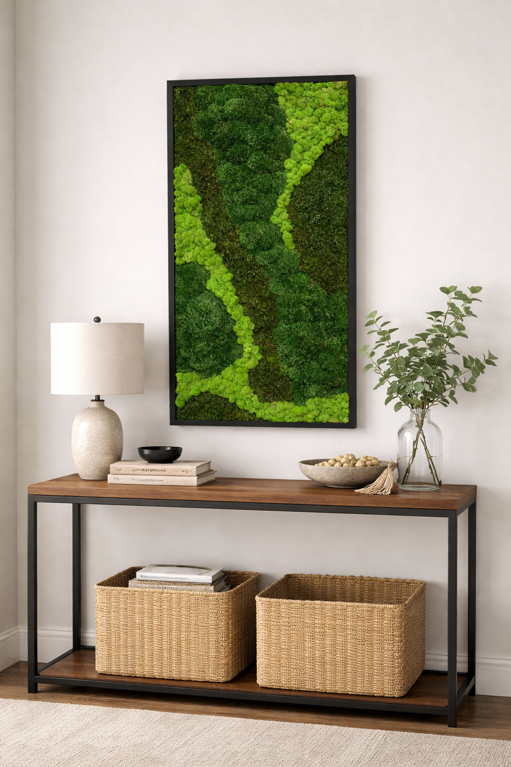 Each moss frame is carefully composed using sustainably preserved moss and natural botanicals to create a maintenance-free living wall aesthetic that adds warmth, texture, and biophilic beauty to any interior space.