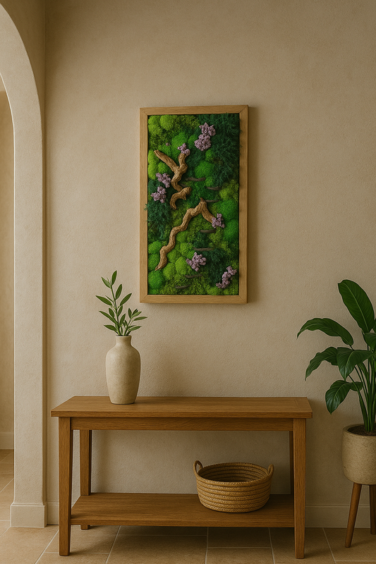 Explore our custom driftwood collection, which combines the natural beauty of preserved moss with the raw textures of reclaimed driftwood. Each piece of this moss wall art feels both organic and timeless, highlighting the unique character of the wood and the lushness of the moss to bring warmth and authenticity into your space.