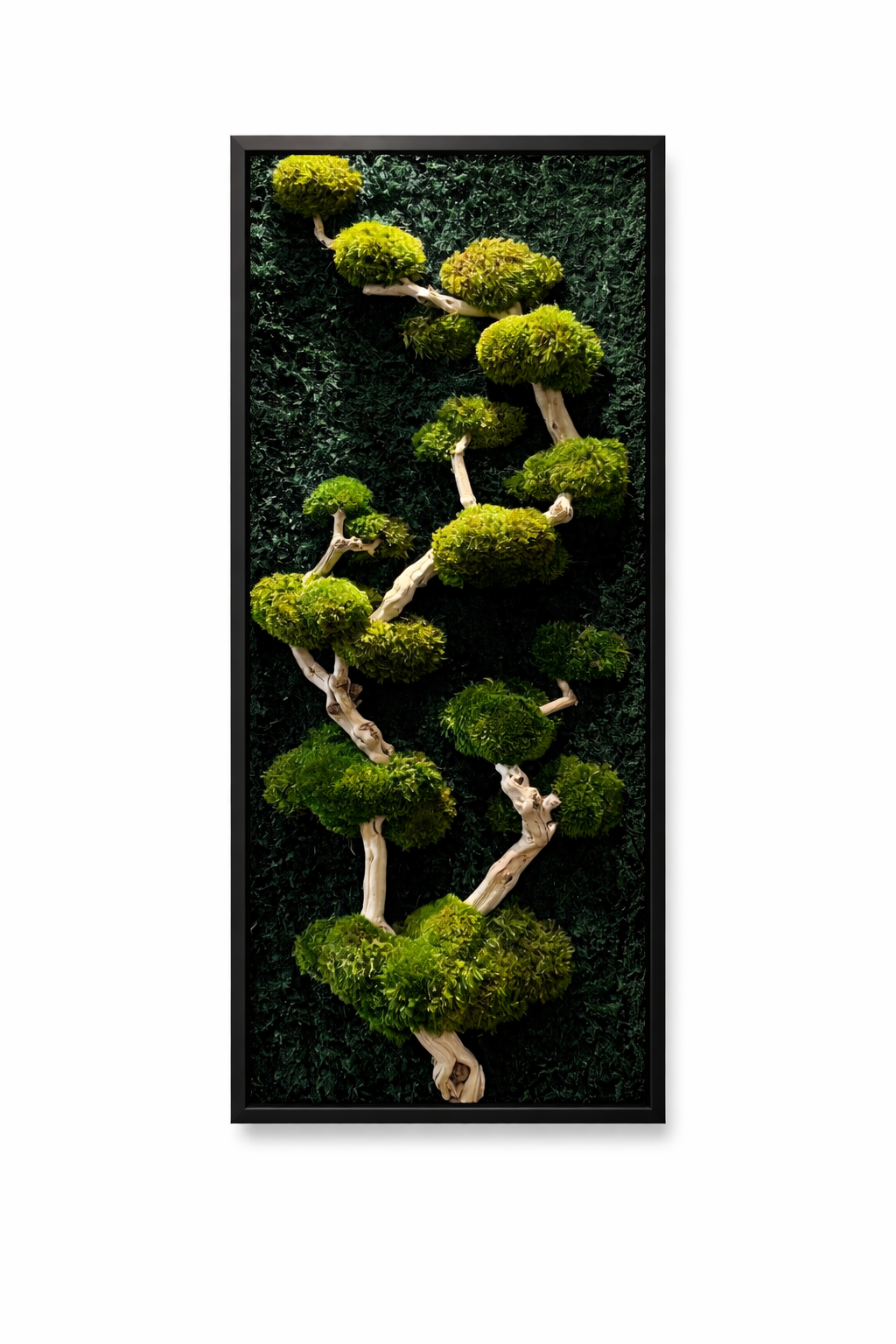 Each moss frame is carefully composed using sustainably preserved moss and natural botanicals to create a maintenance-free living wall aesthetic that adds warmth, texture, and biophilic beauty to any interior space.